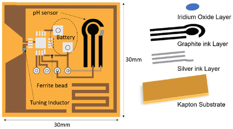 vol. 222, January 2021 In the last decade, wearable sensors have gained a key role on biomedical research field for reliable health state monitoring. A wide plethora of physics marker sensors is already commercially available, including activity tracker, heart rate devices, and fitness smartwatch. On the contrary, wearable and epidermal sensors for chemical biomarker monitoring in several biofluids are not ready yet. Herein, we report a wireless and flexible epidermal device for pH monitoring in sweat, fabricated by encompassing a screen-printed potentiometric sensor, an integrated circuit, and antenna embedded onto the same Kapton substrate. An iridium oxide film was electrodeposited onto the graphite working electrode providing the pH sensitive layer, while the integrated circuit board allows for data acquisition and storing. Furthermore, a radio frequency identification antenna surrounding the entire system enables data transmission to an external reader up to nearly 2 m in the most favourable case. The potentiometric sensor was firstly characterised by cyclic voltammetry experiments, then the iridium oxide electrodeposition procedure was optimised. Next, the sensor was tested toward pH detection in buffer solutions with a near-Nernstian response equal to −0.079 ± 0.002 V for unit of pH. Interference studies of common sweat ions, including Na+, K+ and Cl−, showed any influence on the pH sensor response. Finally, the integrated epidermal device was tested for real-time on-body pH sweat monitoring during a running activity. Data recorded for a running subject were wireless transmitted to an external receiver, showing a pH value close to 5.5, in agreement with value obtained by pH-meter reference measurement. |