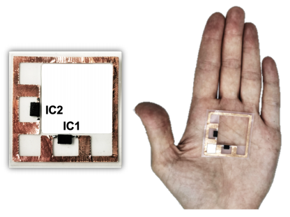 October 2020 Wireless epidermal devices based on Radio frequency Identification (RFID) enable a contactless and noninvasive monitoring of the human body by sampling health parameters directly on the skin. To achieve multi-parametric sensing, while preserving the intrinsic simplicity and the low cost of RFID tags, a dual-chip epidermal device is here proposed. At this purpose a polarization-diversity loop antenna is exploited so that two almost independent current modes are excited. The resulting radiation patterns are both broadside, thus enabling the simultaneous gathering of two independent dataset from the same maximum distance. A 3.5 by 3.5 cm battery-less, flexible and soft prototype provides -13 dBi embedded realized gain with read distances ranging from 0.6m to 1.5m depending on the microchip sensitivity. The electromagnetic performance of the two ports remain similar even when the tag is applied onto rather in-homogeneous body regions. With reference to body temperature monitoring, the device has been experimented in both controlled and real-life environments, demonstrating the possibility of doubling the sensing capabilities of RFID epidermal devices without affecting their size and radiation performances. |